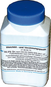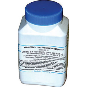 Pasta fluida per stagnare e per saldare a stagno senza disossidante DIN EN 29453. Con stagno allo stato puro 99,9%.Temperatura di fusione 232 °C. In contenitori di plastica da g 1000.