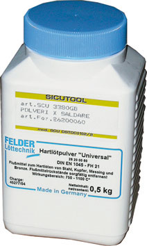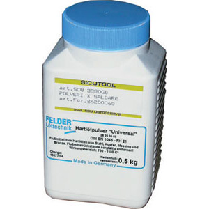 Polvere DIN EN 1045. Per saldare rame, ottone, bronzo e acciaio. Indicato per il montaggio di placchette Widia ed altro metallo duro. Temperatura d'uso da 800 °C a 1100 °C. In contenitori di plastica da g 500.