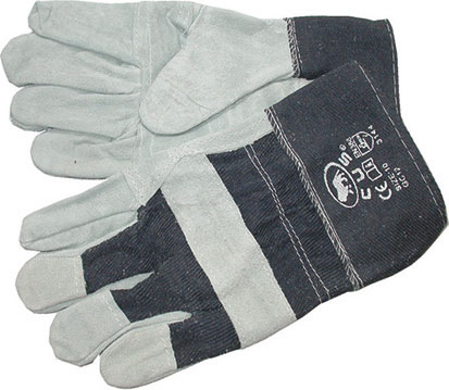 Tipo a 5 dita, con palmo, salvaunghie e salvanocchie in pezzame di pelle crosta, manichetta e dorso in tela. CAT. 1. Taglia 10. Conformi alle vigenti norme Europee.