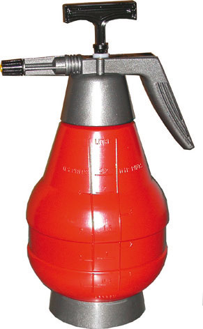 Tipo industriale. Modello a pressione con pompa nebulizzatrice di grande portata, guarnizione in Viton, per olii leggeri, gasolio e prodotti detergenti (non acidi). Becco con ugello regolabile e getto in ottone. Robusto serbatoio in polietilene, graduato con base d'appoggio.