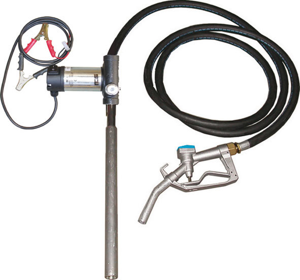 Funzionamento a batteria 12 V. Indicata per nafta e gasolio (non per benzina e olio di colza). Pompa fornita con tubo di aspirazione lungh. m 1 con filtro e attacco fusti G 2". Cavo lungh. m 1,8 completo di morsetti. Pistola di travaso e tubo di erogazione, lungh. m 4. Erogazione 38 l/min.