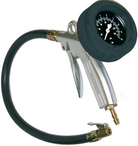 Tipo normale di sicurezza per il controllo della pressione e il gonfiaggio delle gomme. Manometro di precisione con rivestimento in gomma Ø mm 63. Corpo in alluminio forgiato. Protetto contro urti e intemperie. Per pressioni da 0-10 bar (Atm). Suddivisione 1/10. Adatto anche per gonfiaggi con AZOTO. Tubo di gomma con testina gonfiaggio. Attacco gomma Ø mm 6.