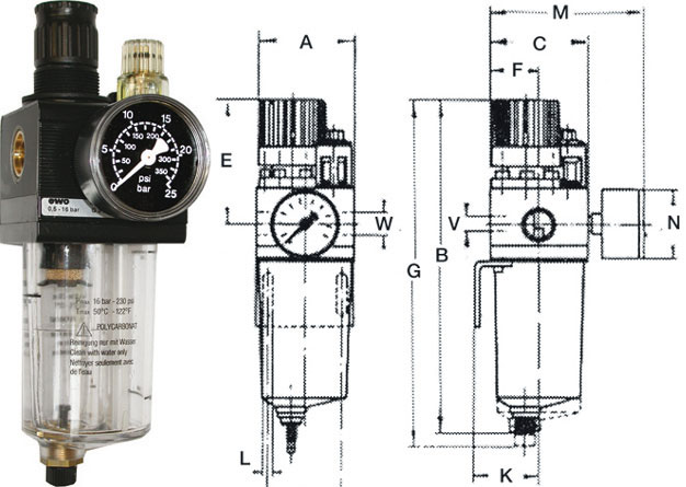 GRUPPI BREVETTATI MONOBLOCCO FILTRO-RIDUTTORE-LUBRIFICATORE Nuova costruzione brevettata estremamente compatta. La tecnologia e la qualità dei componenti permettono di eseguire il filtraggio, la riduzione e la lubrificazione dell'aria con un gruppo di dimensioni ridottissime. Bicchieri in robusto policarbonato trasparenti, infrangibili accoppiati su unico asse. Con spia di lubrificazione. Capacità di regolazione da 1 a 16 bar (Atm). Con manometro da 0 a 25 bar (Atm). Porosità filtro in bronzo sinterizzato µm. 50-75. Temperatura d'uso 0 °C +50 °C.