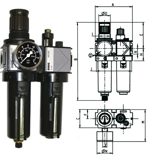 Gruppi di 2 unità. Tipo compatto per lo sfruttamento di spazi ristretti. Costruzione di nuova concezione modulare. Bicchieri in metallo, a sgancio rapido, per resistere agli olii sintetici più aggressivi, a temperature fino a 50 °C e a più forti pressioni fino a 20 bar. Con dosatore dell'olio in metallo. Con scala manometro da 0 a 16 bar (Atm). Capacità di regolazione da 1 a 10 bar (Atm). Porosità del filtro in polietilene µm 40.