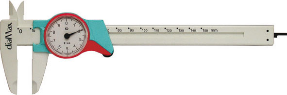 Calibri di precisione a quadrante. Per misure interne, esterne e di profondità; nel campo tecnico-professionale. In superpolliamide con rinforzo del 60% in fibra di vetro. Capacità di misura mm 150. Ogni giro completo della lancetta corrisponde a 10 mm, con divisione 1/10 di mm, precisione secondo DIN 862. Leggero, maneggevole, infrangibile, antiacido, azzerabile, con vetro antiriflesso e antigraffio. Rotella zigrinata e guida del cursore brevettati.