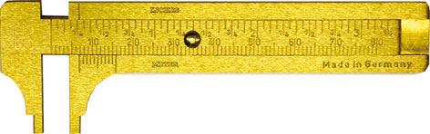 Tipo tascabile. In ottone. Graduazione in mm e in pollici. Nonio 1/10 di mm. Becchi rastremati per misure anche interne.