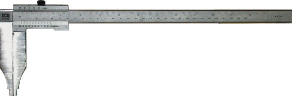 Tipo professionale a becchi lunghi. Precisione DIN 862. In acciaio inossidabile MONOBLOCCO, con asta graduata e nonio cromati opachi. Interamente temprati. Superfici finemente rettificate. Graduazione e nonio con lettura 1/20 di mm, 1/128 di poll.