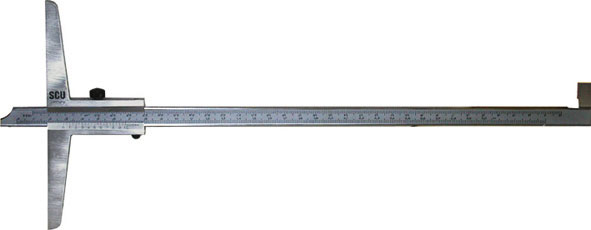 Precisione DIN 862. In acciaio inossidabile, con asta graduata e nonio cromati opachi. Con vite di fermo. Interamente temprati. Superfici finemente rettificate. Graduazione e nonio con lettura 1/20 di mm. Tipo combinato con una estremità dell'asta ad angolo 90°, l'altra estremità rastremata.
