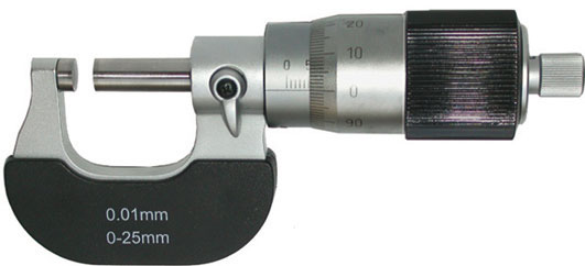 Tipo di precisione, DIN 863. Tamburo maggiorato Ø mm 25. Punte di contatto in metallo duro su asta Ø mm 8. Parti di lettura cromate opache. Divisione 1/100 di mm. Frizione inserita nel tamburo, levetta di bloccaggio e guancialetti atermici. Con misura di controllo da mm 25 in avanti. In cofanetto.