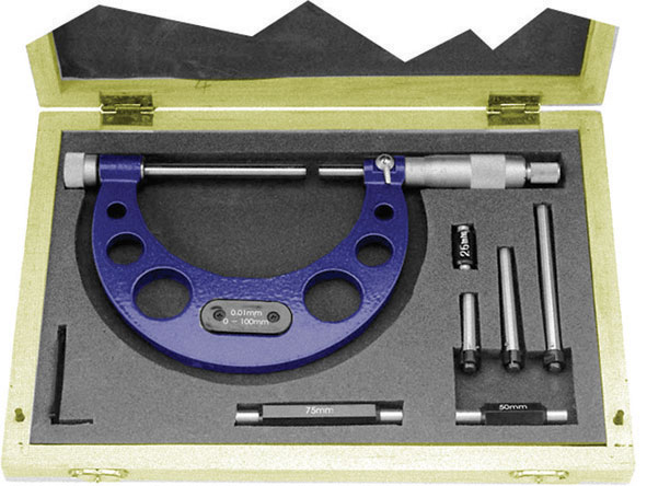 Tipo di precisione a grande capacità. Punte di contatto in metallo duro. Con aste di misurazione intercambiabili. Arco in acciaio. Parti graduate, cromate opache. Divisione 1/100 di mm. Con vite a cricchetto e levetta di bloccaggio. Misure di controllo in dotazione. In cofanetto.