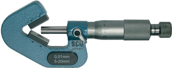 Tipo di precisione. Con 3 punti di contatto in metallo duro. Prisma a 60°. Asta di avanzamento Ø mm 6,5, in acciaio temprato e rettificato. Tipo indicato per la misurazione di utensili a 3 taglienti. Parti graduate, cromate opache. Divisione 1/100 di mm. Con vite sensitiva, levetta di bloccaggio e guancialetti atermici. In cofanetto.