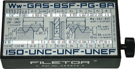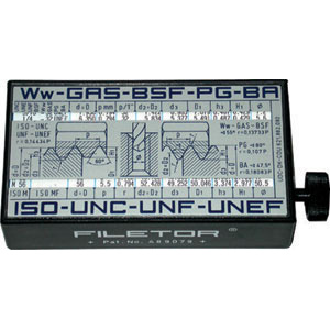 Pratica scatola in plastica antipolvere, antiurto e stagna con apposita rotella per l'indicazione dei parametri più importanti delle seguenti filettature: Metriche ISO - Ww - GAS - BSF - PG - BA UNC - UNF - UNEF. Dimensioni mm 110x60x30.