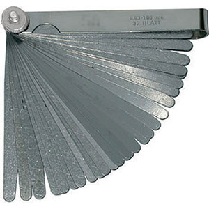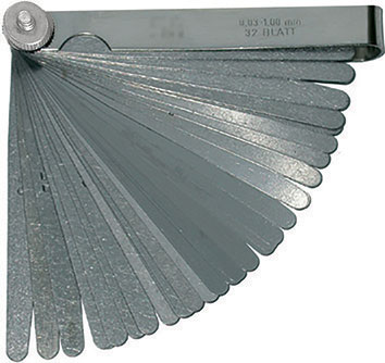 Con 32 lame da mm 0,03-0,04-0,05-0,06-0,07-0,08-0,09-0,10-0,12-0,15-0,18-0,20-0,23-0,25-0,28-0,30-0,32-0,35-0,38-0,40-0,45-0,50-0,55-0,60-0,65-0,70-0,75-0,80-0,85-0,90-0,95-1,00.In acciaio.