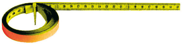 In acciaio smaltato giallo, graduazione a millimetri.Lettura da destra a sinistra, larghezza e spessore mm 13x0,2.