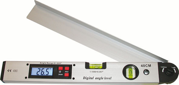 Tipo profilato in alluminio con 2 bolle infrangibili, orizzontale e verticale. Misuratore elettronico d'inclinazione con lettura del display in gradi. Divisione 0,1°. Con tasto ON/OFF, tasto HOLD per la memorizzazione della misura e tasto per la retroilluminazione del display. Per angoli da 0° e 225°, precisione ± 0,1°. Con manopola di bloccaggio. Funzionamento con batteria a 9 V (Art. 3600 M), in dotazione. Lunghezza livella mm 400. In custodia.