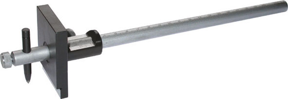 In acciaio. Tracciatore con asta tonda millimetrata.Flangia di appoggio a corsoio. Lettura 1/10 di millimetro.Punta a tracciare in metallo duro Ø mm 6.