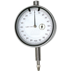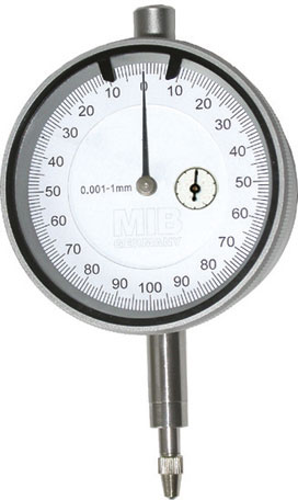 DIN 878. Divisione 1/1000. Con 2 lancette per l’indicazione dei decimi, centesimi e millesimi di millimetro. Azzeramento mediante rotazione del quadrante e vite di fermo. Cassa metallica.