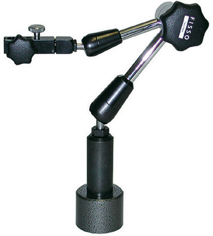 Tipo professionale/industriale con base magnetica. Esecuzione fine di alta precisione, particolarmente stabile e robusta, con bloccaggio rapido centrale a manopola. Bracci cromati con snodi di precisione, corsa particolarmente guidata e regolazione micrometrica. Dimensione base tonda mm 40 x 30 h. Raggio d'azione mm 200. Altezza totale mm 335. Per comparatori con attacco Ø mm 8 e comparatori/tastatori con attacco a coda di rondine.