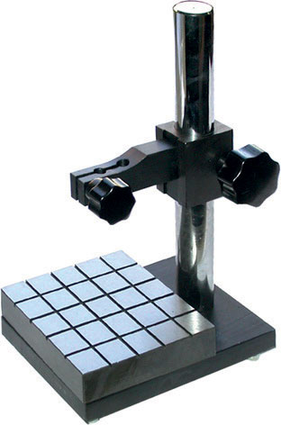 Tipo con piano quadro fisso, di verifica, in acciaio temprato, rettificato e lappato. Braccio portacomparatore spostabile, colonna in acciaio temprato e rettificato. Dimensione piano mm 100x100. Altezza utile mm 160. Altezza totale mm 255. Diametro colonna mm 24. Per comparatori con attacco Ø mm 8.