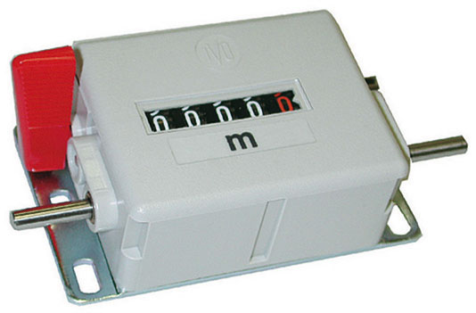 Addiziona in una direzione. Sottrae nel senso inverso. 5 giri uguali a 1 metro. Per ruota circonferenza mm 200. Velocità massima 200 metri al minuto. Azzeramento mediante levetta spostabile. Conta fino a 9999,9 metri. Diametro albero mm 4. Altezza cifre mm 4,5. Dimensioni base mm 80x48.