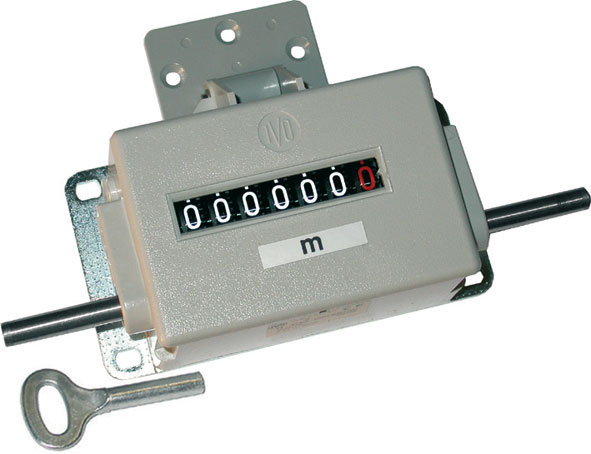 Addiziona in una direzione di rotazione. 2 giri uguali a 1 metro. Per ruota circonferenza mm 500. Velocità massima c.ca 100 metri al min. Azzeramento mediante chiavetta estraibile. Conta fino a 999.999,9 metri. Diametro albero mm 7. Altezza cifre mm 7. Dimensioni base mm 120x64.