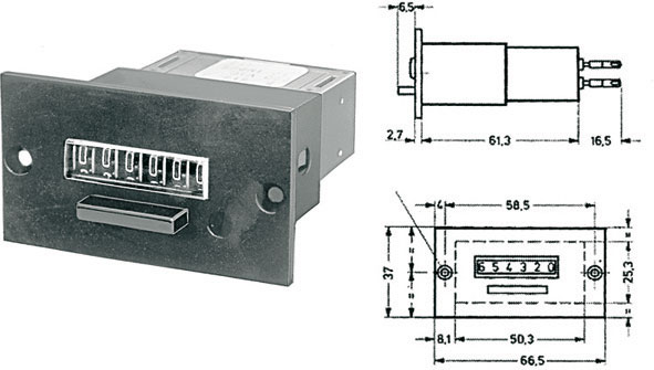 Tipo da incassare, con fissaggio a vite. Sistema ADDIZIONANTE - Elettrico. Serve come contagiri e contacolpi. Può essere collegato a qualsiasi distanza dall’impulsogeno montato sulla macchina operatrice. Velocità massima 10 impulsi al secondo. La durata dell’impulso non deve essere inferiore a 25 millisecondi. 1 impulso addiziona 1 numero. Numeratore a 6 cifre per sommare sino a 999.999. Altezza delle cifre mm 4,5. Azzeramento immediato tramite pulsante.