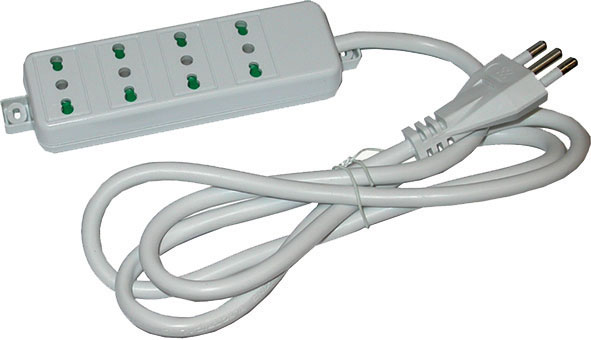 Tipo a ciabatta liscia con 4 prese bipasso 10 A/16 A. Corpo in materiale sintetico. Con cavo di alimentazione, sezione mm^2 3x1,5, lunghezza m 1,5. Spina 16 A.