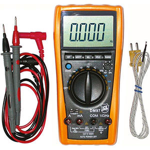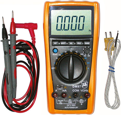 Tipo elettronico digitale. Per elettrotecnici. Selezione delle funzioni e delle misure mediante commutatore. MISURAZIONE DELLA TEMPERATURA mediante sonde K, Art. 4476 GH, in dotazione. (Per altre sonde ved. Art. 4476 GL a 4476 GS). Polarità automatica. Lettura su display. Indicatore di batteria scarica. Con test: diodi, transistor, di continuità con buzzer e prova capacità. Tensione/Corrente continua: portata 400 mV a 1000 V/400 µA a 20 A. Tensione/Corrente alternata: portata 400 mV a 750 V/400 µA a 20 A. Resistenza: portata 400 ohm a 40 Mohm. Frequenza: portata 100 Hz a 30 MHz. Temperatura: da -40°C a +1000°C. Portata: da 4 nF a 200 µF Alimentazione: 2 batterie alcaline a 1,5 V (Art. 3600 C), in dotazione. Autospegnimento per risparmio della batteria.