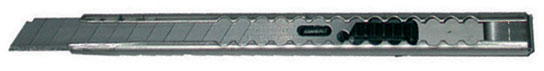 Tipo professionale. Lama con movimento/blocco a pulsante. Impugnatura in acciaio inossidabile sottile, maneggevole, robusta. Con clip.Provvisto di 3 lame a settori.