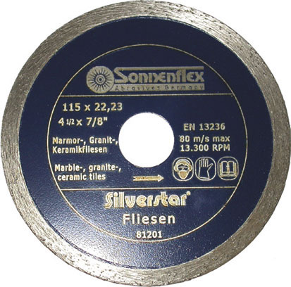 Tipo a taglio continuo diamantato. Adatto per macchine portatili. Per tagliare a secco marmi, graniti sottili, piastrelle, ceramiche, fibre sintetiche ecc. Foro Ø mm 22.