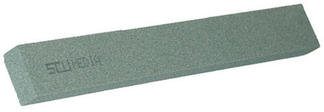 In carburo di silicio. Per affilare o rettificare acciai duri o temprati, Widia, ecc. Uso a secco, acqua o olio. Grane: M (180 Media) - F (220 Fine). Colore verde.