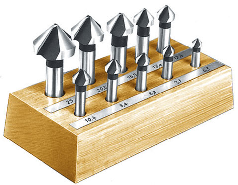 Assortimenti di 10 pezzi.Frese a 3 taglienti. Art. 8810 G. Conicità 90°.Ø mm: 6,3 - 7,3 - 8,3 - 9,4 - 10,4 - 12,4 - 13,4 - 16,5 - 20,5 - 25.L’assortimento completo con espositore.