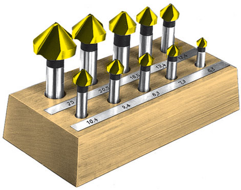 Assortimenti di 10 pezzi.Frese a 3 taglienti. Art. 8812 G. Conicità 90°.Ø mm: 6,3 - 7,3 - 8,3 - 9,4 - 10,4 - 12,4 - 13,4 - 16,5 - 20,5 - 25.L’assortimento completo con espositore