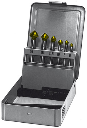 Assortimenti di 6 pezzi.Frese a 3 taglienti. Art. 8812 G. Conicità 90°.Ø mm: 6 - 8 - 10 - 11,5 - 15 - 19.L’assortimento in cassetta metallica.