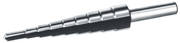 Tipo a 9 gradini e 2 taglienti rettificati.Per creare e allargare fori in lamiere, per spessori fino mm 5.Attacco cilindrico.