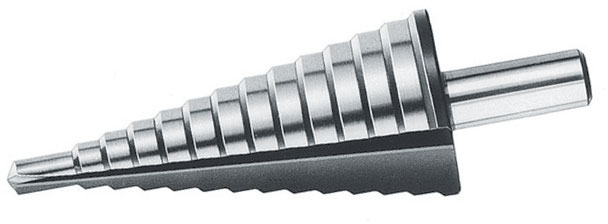 Tipo a 13 gradini e 2 taglienti rettificati.Per creare e allargare fori in lamiere, per spessori fino mm 4.Attacco cilindrico.