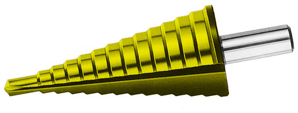Tipo a 13 gradini e 2 taglienti rettificati.Per creare e allargare fori in lamiere, per spessori fino mm 4.Attacco cilindrico.