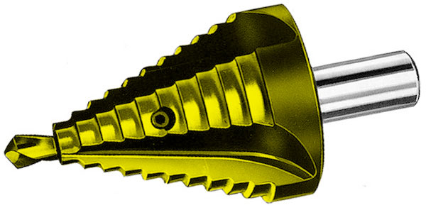 Tipo a 10 gradini.Per creare e allargare fori in lamiere, per spessori fino mm 4.Punta guida intercambiabile Ø mm 7.Attacco cilindrico.