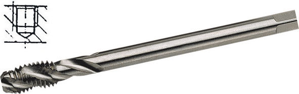 HSS-E. Tipo con elica a circa 35°, per filettature profonde superiori a 1 1/2 il diametro. Imbocco corto. Per metalli fino R 900 N/mm², per acciai legati e non legati. Fori ciechi profondi.