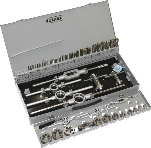 Passo Metrico Grosso MAssortimento in acciaio SUPER-RAPIDO HSS.Serie di 3 maschi a mano e 1 filiera per misura.Giramaschi regolabili, giramaschi con cricchetto e portafiliere come da assortimento.In cassetta.