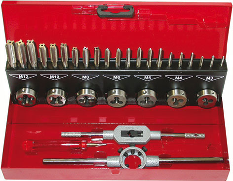 Contenuto:1 serie per misura maschi a mano in HSS - Art. 9401 G M 3-4-5-6-8-10-121 pz. per misura filiere in HSS - Ø mm 25x9 M 3-4-5-6-8-10-121 giramaschi regolabile Gr. 1 1/21 portafiliere Ø mm 25x9".In cassetta.