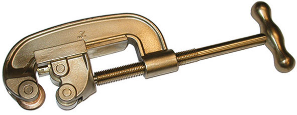 In lega bronzo-alluminio. Con rotella per tubi acciaio e 2 guide.