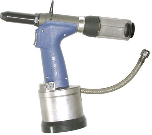 Tipo oleo-pneumatico, leggero e maneggevole per lavori di manutenzione. Corpo in lega leggera, parti operanti in acciaio, impugnatura in materiale isolante. Attacco aria poll 1/4 GAS femmina (per attacco rapido unificato ved. Art. 3478 D 1/4). Pressione d'uso 6,5 Atm. Con trattenuta del rivetto e serbatoio in plastica, raccogli-spezzoni.