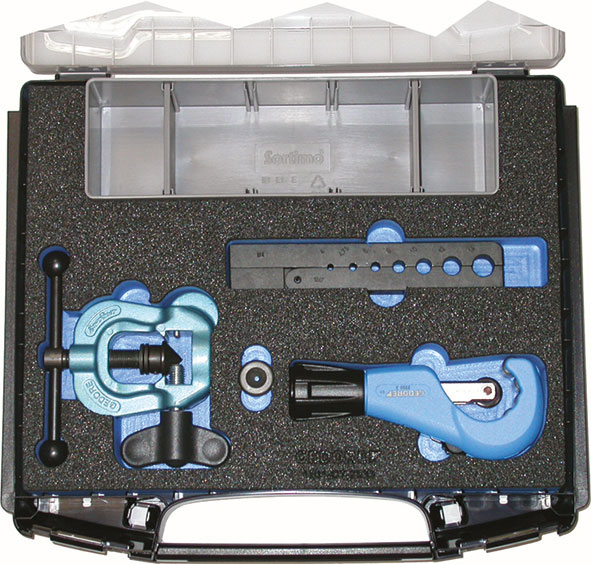Composizione:1 bordatore per tubi Art. 776 GAB1 tagliatubi ad avanzamento automatico per tubi Ø mm 3 a 35Assortimento completo in cassetta.