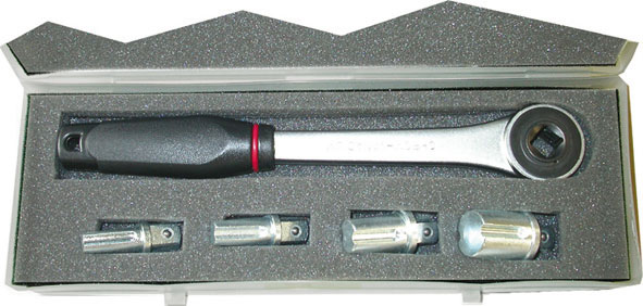 In acciaio al CROMO-VANADIO. Adatte per la sostituzione di raccordi per il fissaggio delle valvole di regolazione termostatiche nei radiatori dei circuiti di riscaldamento. Composti di chiavi ad inserto per raccordi poll 3/8 - 1/2 - 3/4 - 1 ed una leva di manovra per dette. In astuccio di plastica.