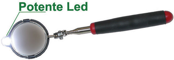 Tipo telescopico con specchio snodato Ø mm 56, LED a luce bianca (si accende mediante interruttore posto sul retro dello specchio) e impugnatura in materiale bicomponente antiscivolo. Funzionamento con batterie al litio Art. 3600 R, in dotazione.