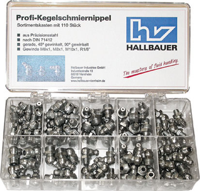 Assortimento ingrassatori. In pratica cassetta per un facile prelievo. Contenuto 110 pezzi: 30 pezzi Art. 3424 GR x 1 20 pezzi Art. 3424 GR x 2 10 pezzi per tipo Art. 3424 GR x 3-4 5 pezzi per tipo Art. 3424 GS x 1-4 10 pezzi Art. 3424 GS x 2 5 pezzi per tipo Art. 3424 GT x 1-4 10 pezzi Art. 3424 GT x 2 L'assortimento completo.
