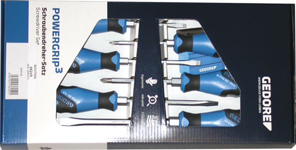 Giraviti, linea industriale per le massime prestazioni, con impugnatura anatomica di grande potenza, antiscivolo, ottenuta mediante la combinazione di 3 materiali plastici molto rigidi (anima), rigidi (parte anteriore) e morbidi (parte centro-posteriore). Lame in acciaio MOLIBDENO-VANADIO 73Mo V52. Con misure riportate, esecuzione cromata opaca, punte grigie di alta precisione. Foro di aggancio.