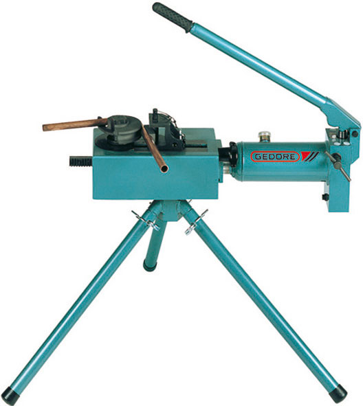 Apparecchio per curvare tubi. Per curve destre o sinistre. Curva a freddo i seguenti tubi senza riempimento fino a 180°: tubi di acciaio inossidabile fino a Ø mm 22 con spessore max. mm 1,5, tubi di rame crudo e ricotto DIN EN 1057 fino Ø mm 28, tubi idraulici e acciaio dolce fino a Ø mm 28 con spessore max. mm 2, tubi gas e acqua DIN 2440 da Ø 3/8-1/2-3/4. Corpo e pompa di grande robustezza e potenza (60 kN). Corredato di 3 gambe di supporto e 1 leva di comando con impugnatura. In cassa di trasporto.