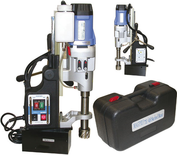 Tipo a base girevole a 30° e orientabile di 20 mm in senso longitudinale. Costruzione robusta, stabile, con supporto magnetico che permette l'impiego verticale, orizzontale o capovolto. Motore monofase 230 V-50 Hz con interruttore di sicurezza di sovraccarico incorporato. Munito di dispositivo contro l'avviamento involontario del trapano prima che sia inserito il magnete. Con inversione di rotazione per operazioni di maschiatura. Lubrificazione automatica. Attacco Weldon Ø mm 19 e CM 3. In pratica valigetta di trasporto.